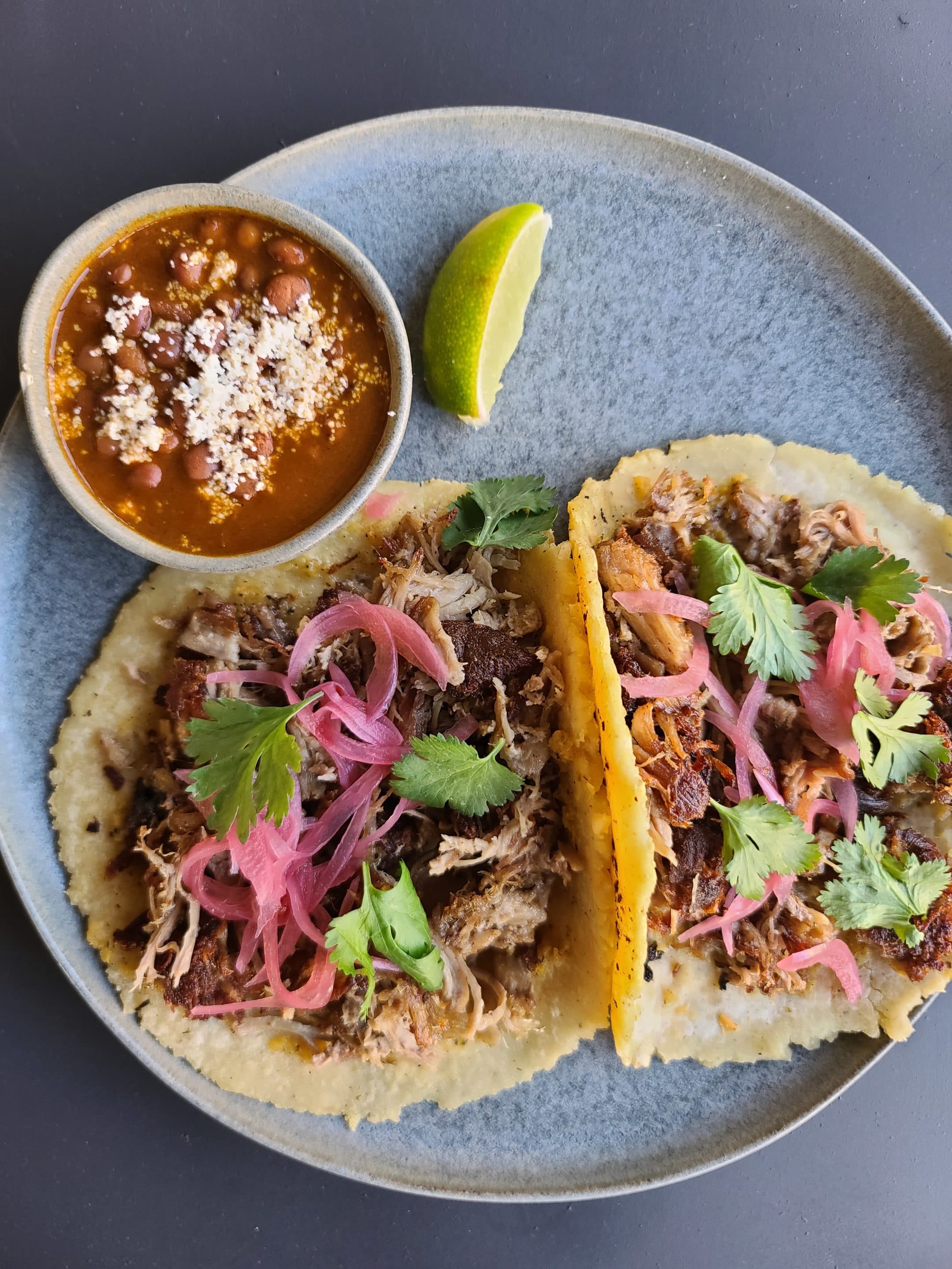 2 per order – served on hand pressed corn tortillas with a side of Lompoc Valley’s pinquito beans